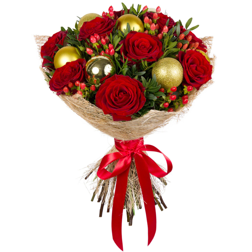 Розы как никакое другое растение способны выразить элегантность образа. Воплощение изящества, благородством и чистотой линий они придают флористическому произведению необыкновенную изысканность. Очень выразителен двойной контраст — цвета и фактуры. Дорогой тяжёлый бархат тёмно-бордовых роз окружают золочёные праздничные шары. Глянцевые ягоды превосходно наполняют букет, добавляя ему пышности.