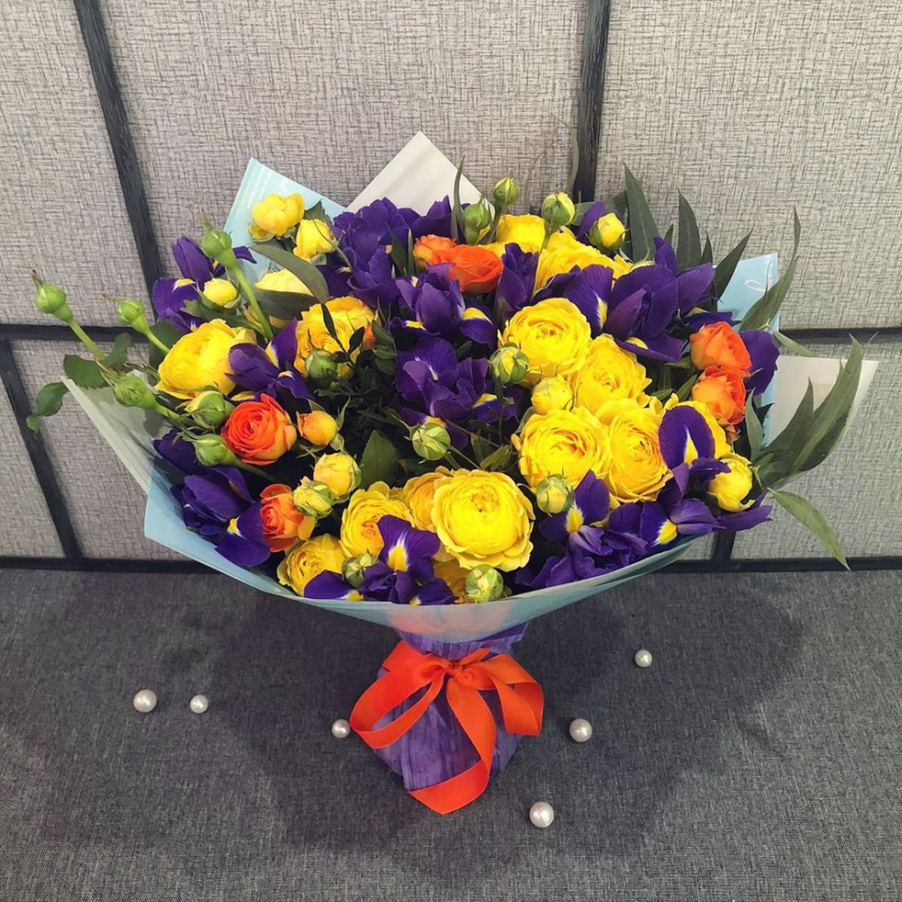 Роскошный букет из синих ирисов и кустовых роз с зеленью – гармония контрастов